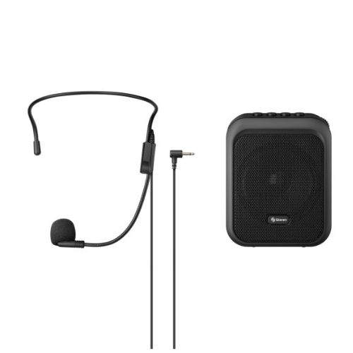 Potencia de 70 WPMPO Micrófono flexible con filtro antirruido y cuello flexible Bluetooth para vincular tu celular Reproductor MP3 para memorias USB o microSD Batería recargable para hasta 4 h de uso Incorpora clip para colgarlo en el cinturón
