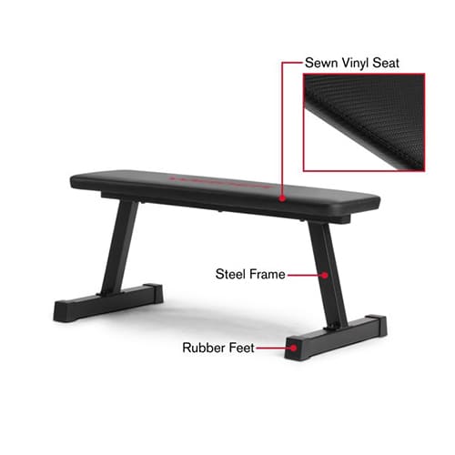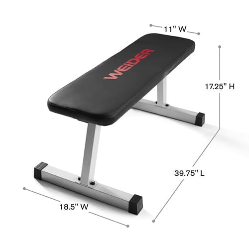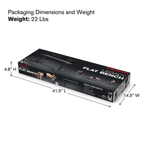 Forjado en acero duradero y envuelto en un elegante vinilo negro, el banco plano tradicional de Weider es el complemento perfecto para cualquier gimnasio en casa. Construido para soportar hasta 460 libras, este banco de pesas duradero proporciona una superficie cómoda y segura en la que puede realizar una variedad de ejercicios de fortalecimiento en el hogar. El vinilo cosido es resistente a los desgarros y fácil de limpiar después de cada entrenamiento intenso. Mantenga fácilmente un espacio de entrenamiento higiénico en su gimnasio en casa. Utilice el banco plano tradicional de Weider para realizar abdominales, fondos de tríceps, estocadas con una sola pierna y otros ejercicios de peso corporal. Invierta en su propia barra, mancuernas o pesas rusas (se venden por separado) para complementar su ejercicio con entrenamiento con pesas. Guíe su entrenamiento con una tabla de ejercicios incluida que enseña una variedad de entrenamientos efectivos de fortalecimiento y muestra la forma de levantamiento adecuada.