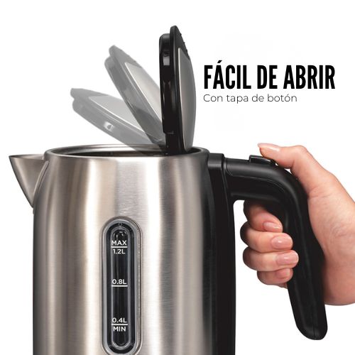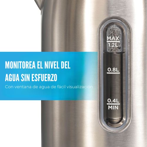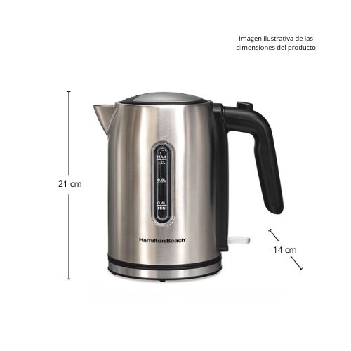 El hervidor eléctrico Hamilton Beach® de 1.2 litros con agarre ergonómico tiene 1500 vatios para calentar el agua más rápido que un microondas y de forma más segura que un hervidor convencional. Hierve el agua rápidamente con solo accionar el interruptor de encendido/apagado. El hervidor se apaga automáticamente y cuenta con protección contra ebullición en seco que evita que el agua se queme. El hervidor inalámbrico se separa de la base para servir agua caliente en la mesa o en cualquier lugar donde se sirvan bebidas calientes. Cuenta con una práctica tapa con botón para abrirlo y llenarlo fácilmente. Controle el agua mientras se calienta sin esfuerzo gracias a su ventana transparente. Siempre sabrá cuánta agua hay en el hervidor o cuánta ha añadido al rellenarlo. Mantén la encimera libre de cables gracias al práctico organizador de cables situado debajo de la base. Te permite ajustar el cable a la longitud ideal. La luz LED azul se ilumina mientras el agua se calienta.