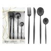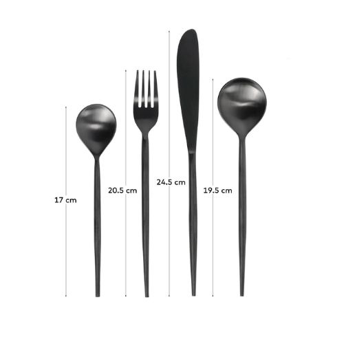 El set de cubiertos, de acero inoxidable, está listo para acompañar desde el primer plato hasta el café, con sus 4 tenedores, 4 cucharas, 4 cuchillos y 4 cucharitas.