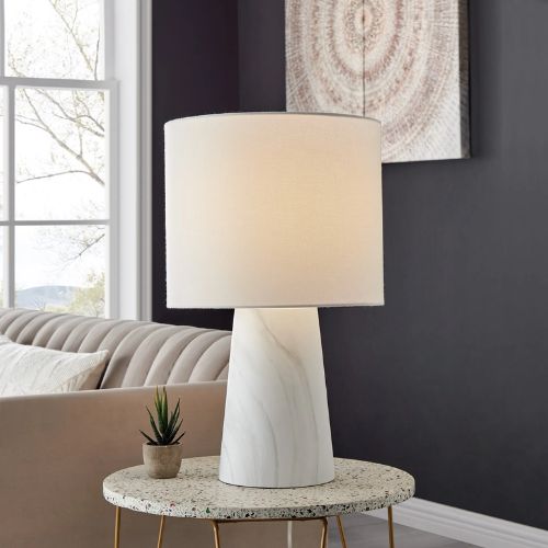 Lámpara de mesa con acabado de mármol blanco, pantlla de tela blanca. De 60W.