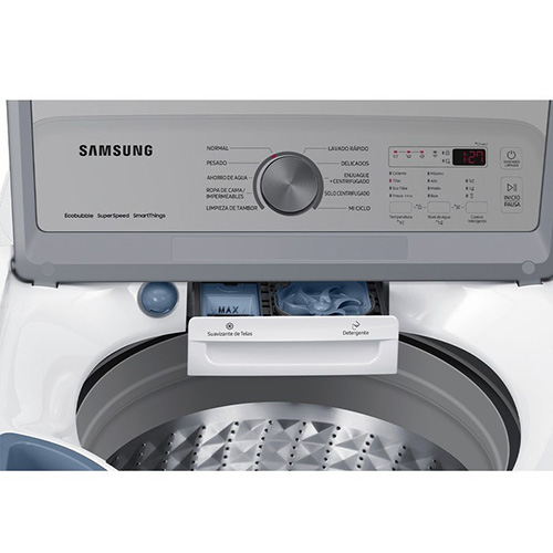 Lava muchos más artículos de lavandería a la vez, ahorra tiempo y esfuerzo. La lavadora tiene una gran capacidad, por lo que puedes colocar mucha ropa en una sola carga, incluidos artículos grandes como un edredón king size. Esto significa que necesitas hacer menos lavados y puedes disfrutar de más tiempo para ti – Disfruta de un lavado de alta eficiencia y alto rendimiento con BubbleStorm™, que incluye tres funciones especiales. Active Bubble™ ayuda a que el detergente penetre 2,5 veces más rápido. CenterJet Pulsator crea una fuerte corriente de remolino que permite una limpieza eficaz. SuperSpeed completa los lavados un 43 % más rápido – Disfruta de eficiencia y rendimiento duradero. La tecnología Digital Inverter utiliza imanes potentes para un rendimiento silencioso y potente con eficiencia energética – Reduce tu tiempo normal de lavado hasta en un 57 % y limpia la ropa por completo. Super Speed lava una carga en solo 31 minutos. Asegura una limpieza potente y reduce el uso de agua en un 7 %. Además, reduce el tiempo de enjuague al disparar chorros potentes de agua y acelera la velocidad de giro – Evita que tu ropa se enrede y se dañe y disfruta de un lavado más tranquilo. La forma y el tamaño especiales del ala del agitador ActiveWave reducen el enredo de la ropa alrededor del pilar del agitador. También gira suave y eficientemente, por lo que produce menos vibración y ruido – Protege la ropa de daños. El diseño único de “rizado suave” de Diamond Drum lava la ropa de manera muy eficaz, mientras la trata con cuidado. Sus suaves crestas en forma de diamante son suaves incluso con artículos delicados. Los pequeños orificios de salida de agua también evitan que la tela quede atrapada y se dañe – Usa tu lavadora de manera fácil y eficaz con la aplicación SmartThings. La receta de lavado recomienda el ciclo de lavado adecuado. El planificador de lavandería optimiza tu horario diario. Y Auto Cycle Link selecciona un curso de secado óptimo después de un lavado – Gestiona tu consumo de energía para ahorrar dinero. SmartThings Energy proporciona consejos de eficiencia energética. También controla el consumo de energía de los electrodomésticos en tiempo real y lo compara con el mes anterior. Y te avisa si se exceden tus objetivos mensuales – Cuida fácilmente tu lavadora o secadora. SmartThings Home Care te notifica cuando es necesario reemplazar las piezas y ayuda a solucionar problemas. También te muestra cómo actualizar el software de servicios y dispositivos. Y proporciona consejos útiles sobre cómo usar tu electrodoméstico, así como un manual del usuario – Reduce el costo y las molestias de los electrodomésticos rotos. Smart Check es un sistema automático de monitoreo de errores que puedes usar en cualquier momento y en cualquier lugar con una aplicación para teléfonos inteligentes. Detecta y diagnostica problemas y proporciona soluciones de solución de problemas rápidas y fáciles, lo que te ahorra tiempo y dinero en reparaciones – Mantén el interior de tu lavadora higiénicamente limpio, mientras ahorras dinero. La autolimpieza elimina la suciedad y las bacterias que causan olores del tambor. Utiliza una combinación de remojo, pulsación y giro a alta velocidad para mantener todo extraordinariamente limpio. E incluso te notifica cuando necesita limpieza – ¡Evita asustarte por golpes inesperados! La puerta de cierre suave se cierra de manera segura, suave y silenciosa, ya que un amortiguador ralentiza automáticamente su movimiento. Una ventana de vidrio templado también te permite ver el lavado sin levantar la tapa. Y es duradera y resistente, por lo que no se raya ni daña – Usa tu lavadora de manera fácil e intuitiva sin preocuparte por salpicar agua en el panel digital. El control posterior inclinado se encuentra en la parte posterior de la máquina. Significa que los controles son realmente fáciles de ver, incluso a distancia, y están protegidos contra salpicaduras de agua al sacar la ropa.