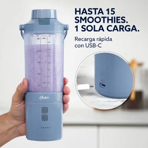 Compacta, potente y a prueba de derrames, es perfecta para llevar a cualquier lugar. Cabe en el portavasos del carro, se guarda fácil en el bolso y se recarga rápido por USB-C. Su motor y tecnología antiatasco logran smoothies cremosos sin interrupciones, donde sea. Tritura con facilidad hielo, frutas congeladas, ingredientes fibrosos como piña o apio, y duros como almendras o coco. La tapa superior tiene apertura automática para tomar directo del vaso. La inferior cierra el vaso al quitar el motor, para llevarlo más cómodo y liviano. Se recarga fácil con USB-C para preparar smoothies en el trabajo, el gimnasio o incluso en el carro, a cualquier hora del día.