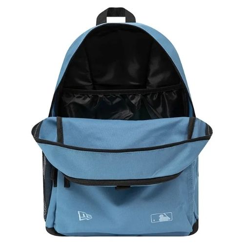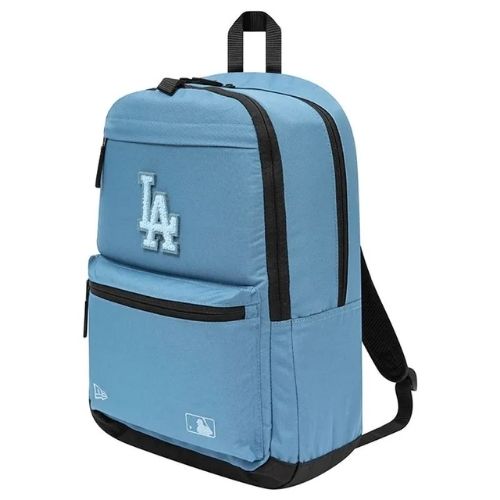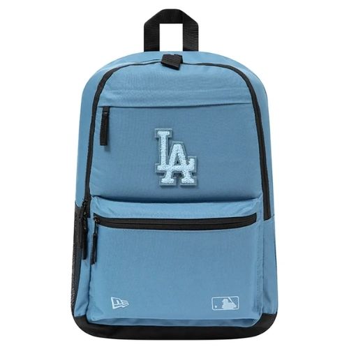 Mochila New Era Los Angeles Dodgers con diseño de tela lisa y múltiples compartimentos, incluyendo bolsillo para botella y espacio para laptop o tablet. Con cierres seguros, correas ajustables y material resistente, es ideal para uso diario, actividades casuales o escolares.