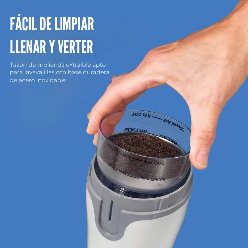 Simplifica la limpieza después de cada molienda: Para que disfrutar de un café por la mañana sin ensuciar, el recipiente de molienda extraíble de acero inoxidable se desmonta en segundos y se puede lavar directamente en el lavavajillas. Además, está diseñado para llenarlo fácilmente y verterlo sin derrames directamente en la cafetera. Ajusta el tamaño de la molida con un solo botón: Sin diales ni pre ajustes, simplemente mantén pulsado para moler y suelta cuando alcances el grosor deseado. Una pulsación corta proporciona una molienda más gruesa para la preparación de café por goteo estándar; mantener pulsado durante más tiempo produce un resultado más fino, ofreciéndote control sin complicaciones. Muela para toda la cafetería: Ya sea que prepares una taza rápida o una jarra completa, este molinillo procesa suficientes granos enteros para preparar hasta 12 tazas en una sola tanda, sin necesidad de realizar múltiples ciclos de molienda para porciones de tamaño doméstico. Confianza desde el primer día: Su funcionamiento intuitivo de pulsar y mantener pulsado no requiere ningún aprendizaje: coloque la tapa, pulse el botón para moler y suéltelo para detenerlo. Un bloqueo de seguridad activado por la tapa impide que el molinillo funcione a menos que la tapa esté bien colocada. Muele más que café: Sus resistentes cuchillas de acero inoxidable muelen rápidamente especias secas, hierbas y semillas, incluyendo granos de pimienta, hinojo, lino, chía y sésamo, por lo que este molinillo se gana su lugar en la cocina incluso después de haber tomado tu café. Despeja la encimera: El compartimento para guardar el cable integrado en la base permite ocultar el cable de alimentación cuando la amoladora no está en uso, lo que ayuda a mantener una encimera limpia y ordenada sin tener que buscar un cajón para guardar el cable.