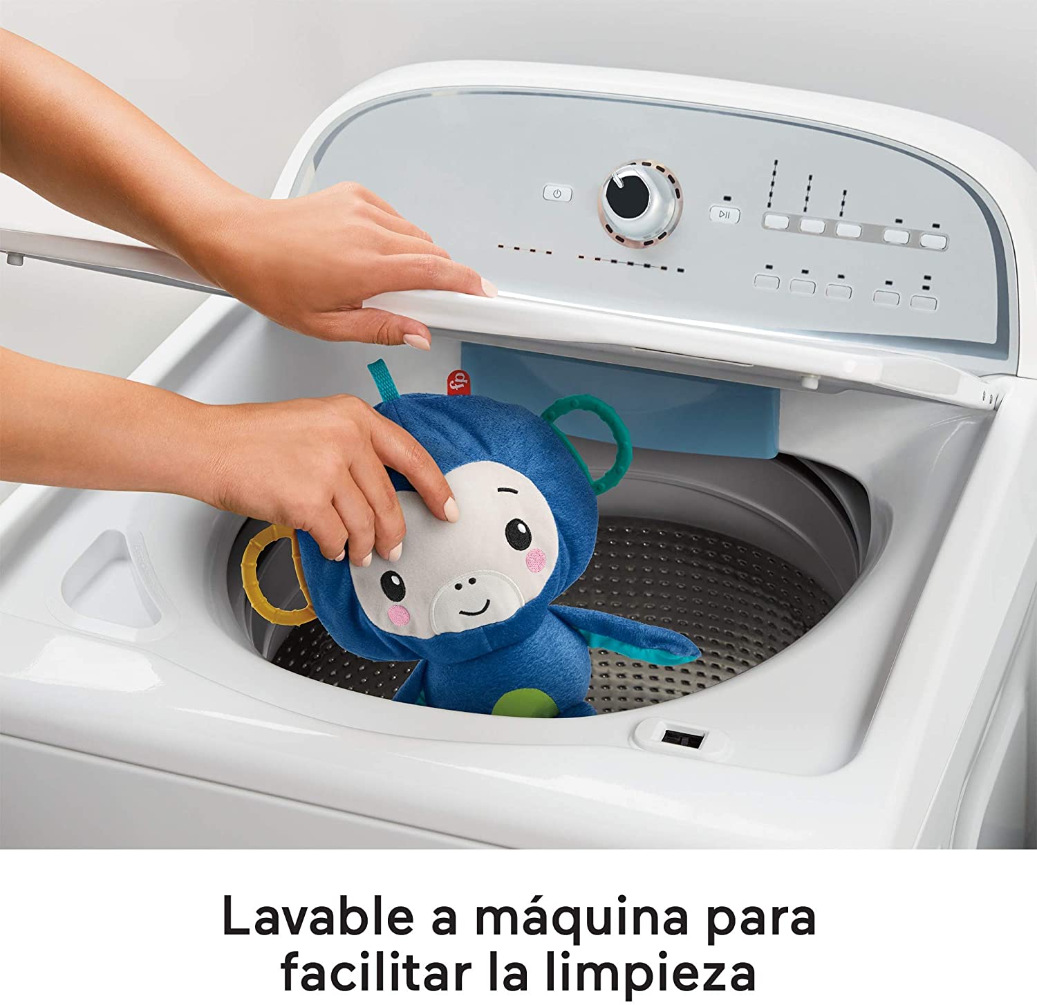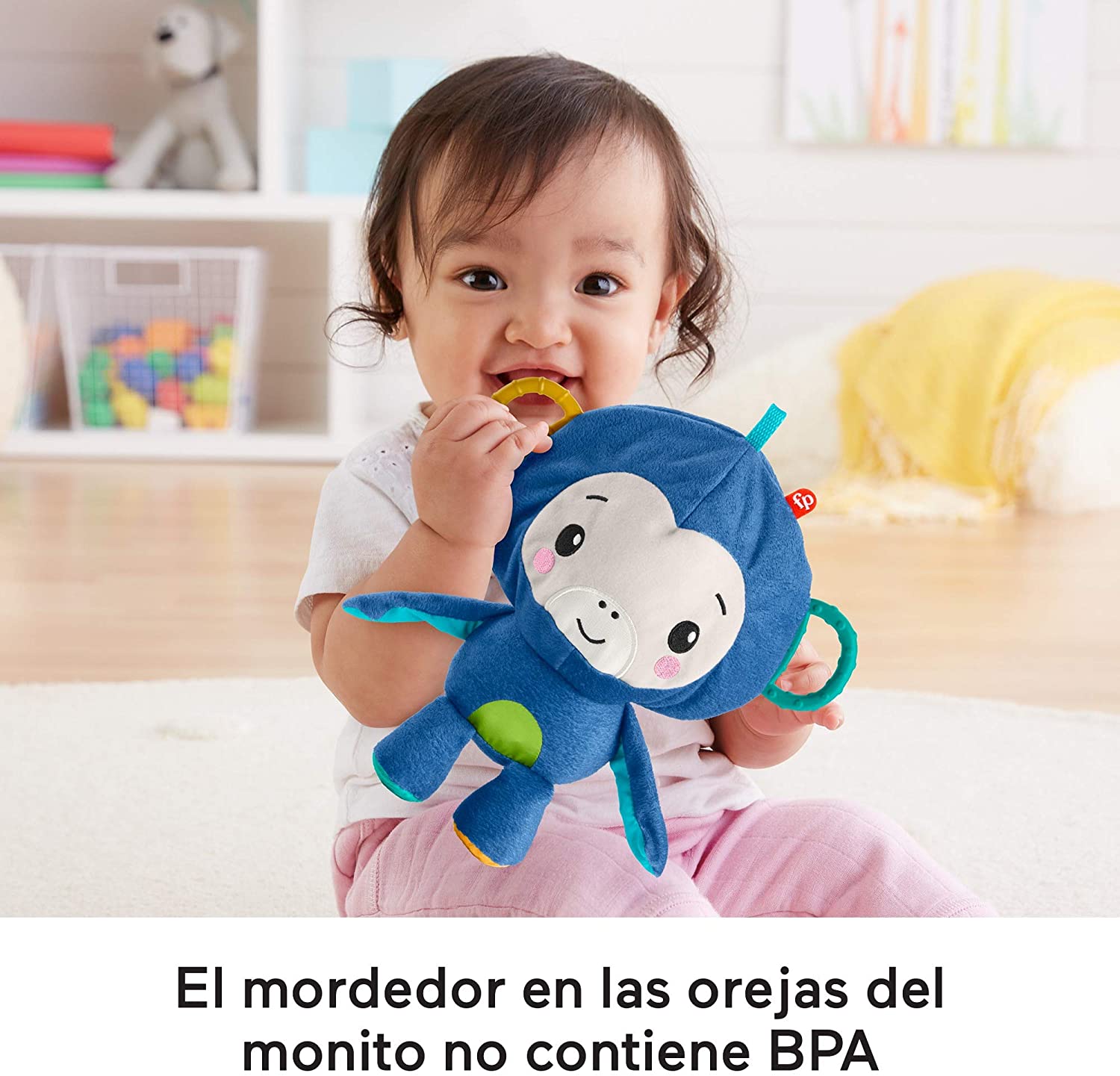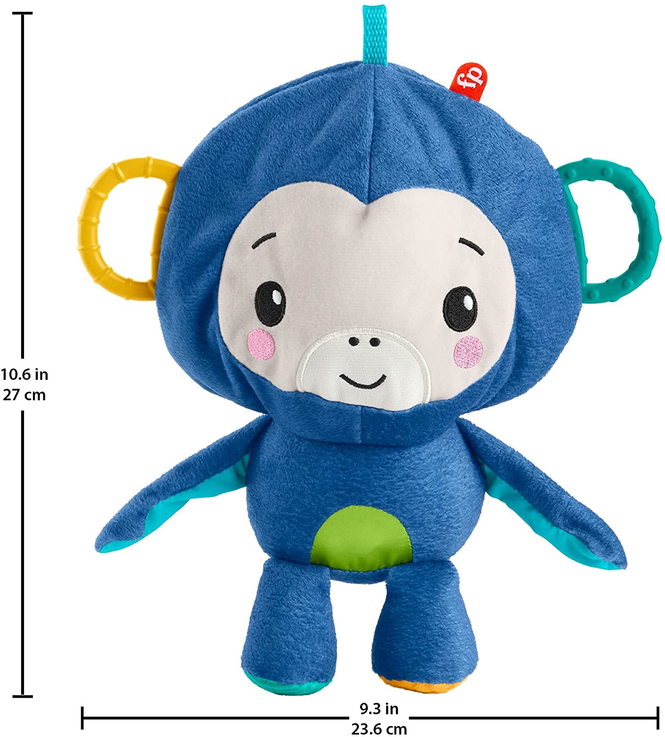 ¡Dale la vuelta al monito de peluche para transformarlo en una pelota! Mordedores sin BPA en las orejas para que el pequeño se divierta mientras muerde. Distintos colores, texturas y sonidos para desarrollar los sentidos del bebé mientras se divierte. ¡Correa para llevar a todas partes!