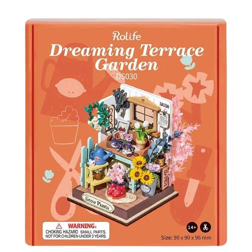 Tierna maqueta de la marca Roylife, de un pequeño rincón de trabajo de jardinería, con una regadera, flores, unas divertidas botas, y muchísimos más detalles. Incluye 72 piezas y todo el material necesario para montarla. Es una actividad divertida que resulta en una pequeña maquetita decorativa.