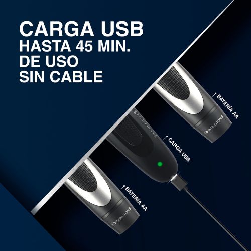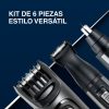 Recortadora de barba con cuchillas de acero autoafilables. Peine para barba ajustable con 9 longitudes (2 mm -18 mm). Uso en seco. Hasta 45 minutos de uso inalámbrico. Tiempo de carga de 16 horas. Recortadora de barba con carga USB. Recortadora de precisión con peine-guía (1 mm – 5 mm), funciona con pilas. Cortador rotativo de nariz y oídos, funciona con pilas. Estuche de almacenamiento. Cepillo para barba.