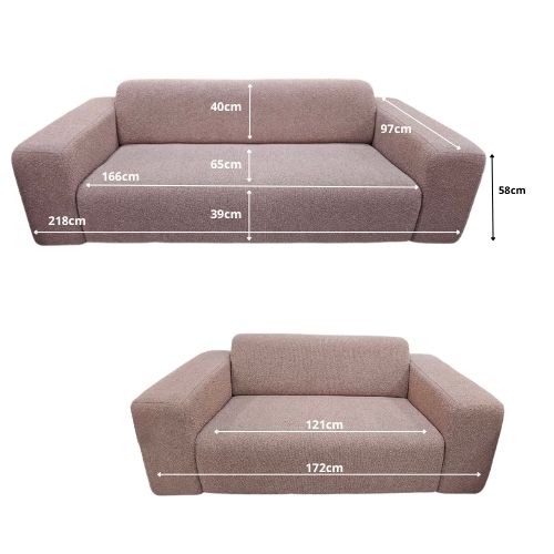 Combina elegancia, comodidad y versatilidad. El diseño invita a una descanso relajado y profundo. Dimensiones. Loveseat: 58cm alto x 172cm ancho x 97cm profundidad / Sofá de tres plazas: 58cm alto x 218cm ancho x 97cm profundidad