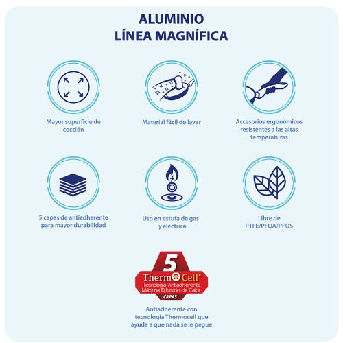 Mayor superficie de cocción. Antiadherente con tecnología Thermocell que ayuda a que nada se le pegue. Accesorios ergonómicos resistentes a las altas temperaturas. 5 capas de antiadherente para más durabilidad. Sarténes fáciles de lavar.