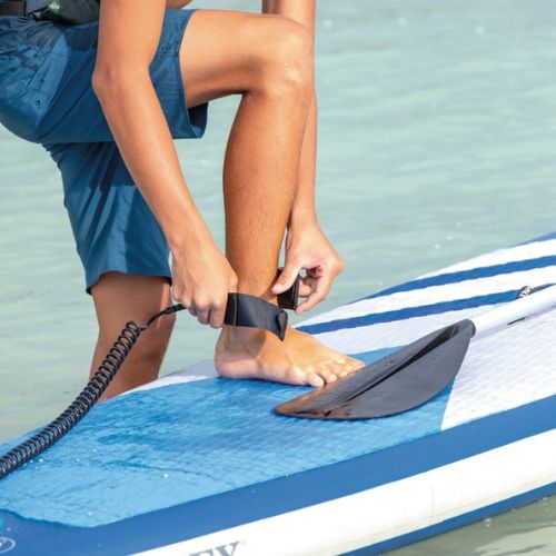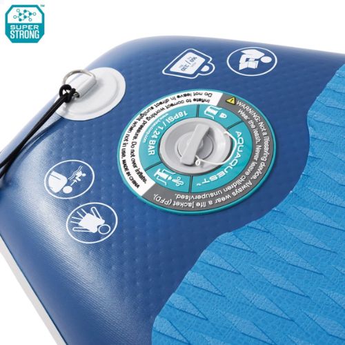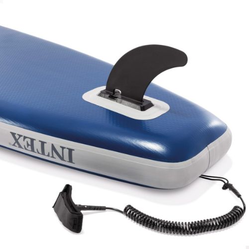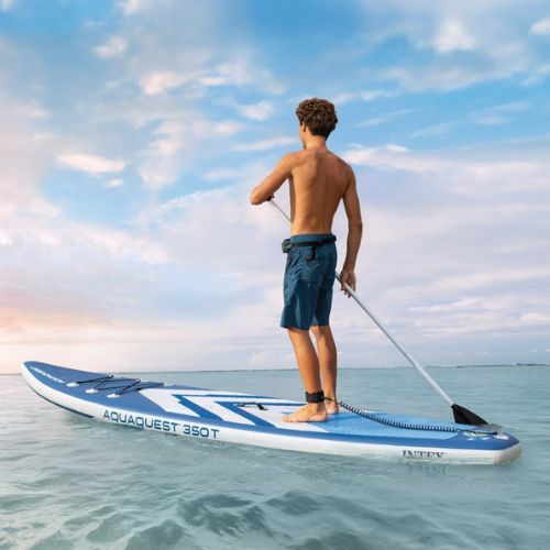 Tabla de paddle surf hinchable INTEX modelo Aqua Quest 350T. Mide 350x79x15 cm, soporta un peso máximo de 160 kg y pesa 14,2 kg. tabla estilo Touring color azul y blanco, con almohadilla antideslizante, asa de transporte acolchada, cuerda elástica de almacenamiento y válvula de aire. bomba de hinchado de doble acción con manómetro para hinchado/deshinchado rápido y fácil (aprox. 10-15 min), mochila cómoda y resistente, remo con mango de aluminio ajustable en altura (1,65-2,16), 1 quilla extraíble y 1 correa en espiral segura y cómoda para enrollar al tobillo. tabla fabricada con sistema SuperTough de doble pared, laterales de PVC de doble capa para mayor durabilidad y almohadilla de EVA antideslizante y remo ligero de aluminio. La tabla se pliega de forma compacta y el remo telescópico de aluminio se desmonta para guardarlo y transportarlo con facilidad junto al resto de accesorios incluidos dentro de la mochila de transporte.