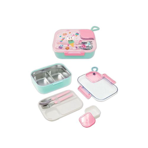 Contenedor de almacenamiento de alimentos de acero inoxidable. Incluye: 1 bandeja de 2 niveles. 1 recipiente para salsa con tapa. 1 tenedor. 1 cuchara.